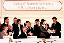 全球面臨經濟衰退,東盟與澳紐簽訂自由貿易協定,增加地區商業往來。根據這項協定,未來12年內,許多商品將陸續降低關稅或免關稅,預估可以增加120億美元的貿易額。